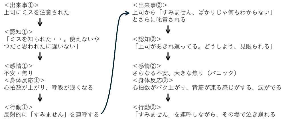 そこじゃなくて、上司に注意された=「使えないやつだと思われたに違いない」 と直結してしまっている認知部分や反射的に謝ってしまうという行動の部分をもう少し変えていけたら、パニックで泣き崩れる以外の行動や展開にできるんじゃない?というアプローチする。